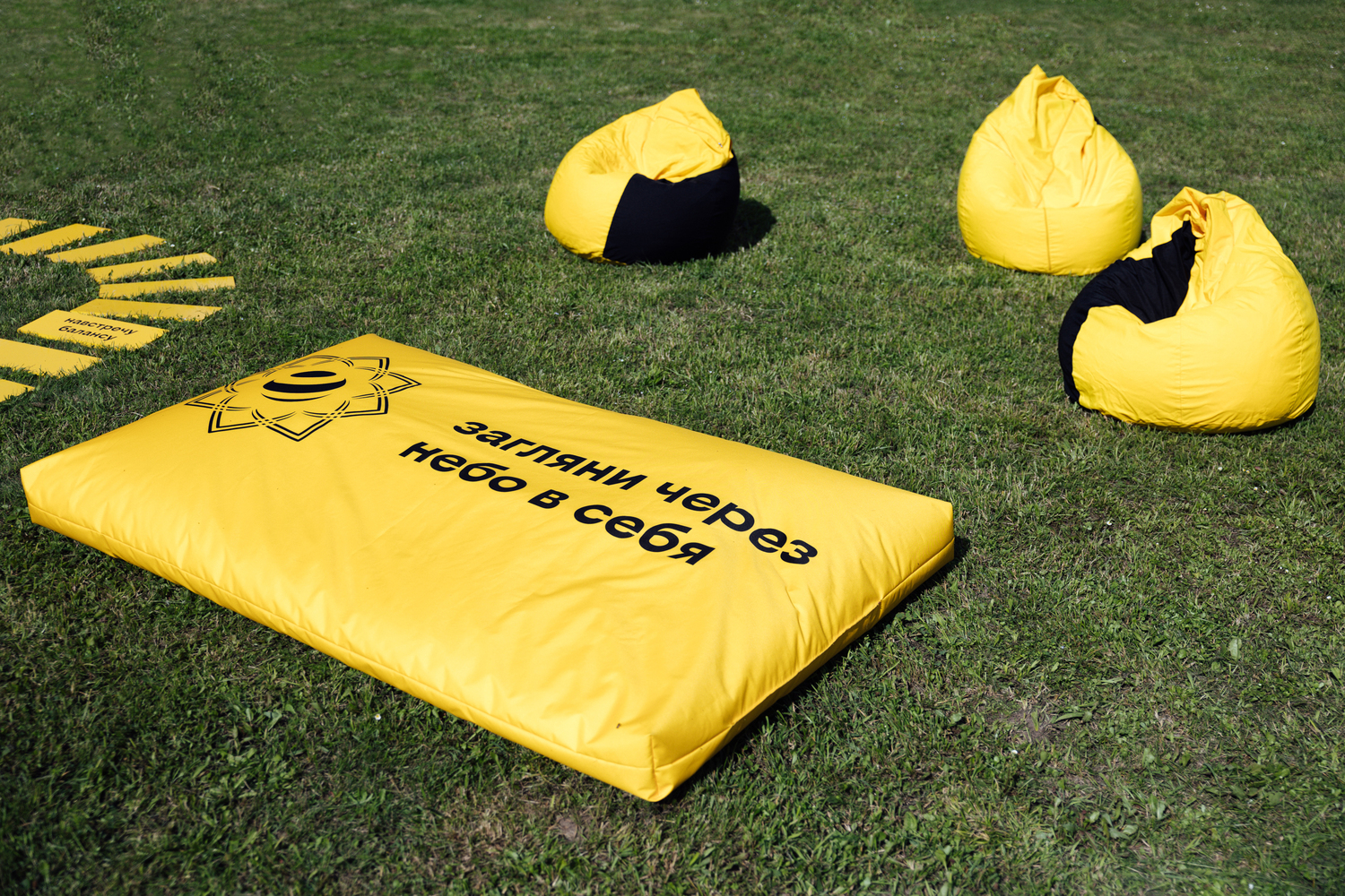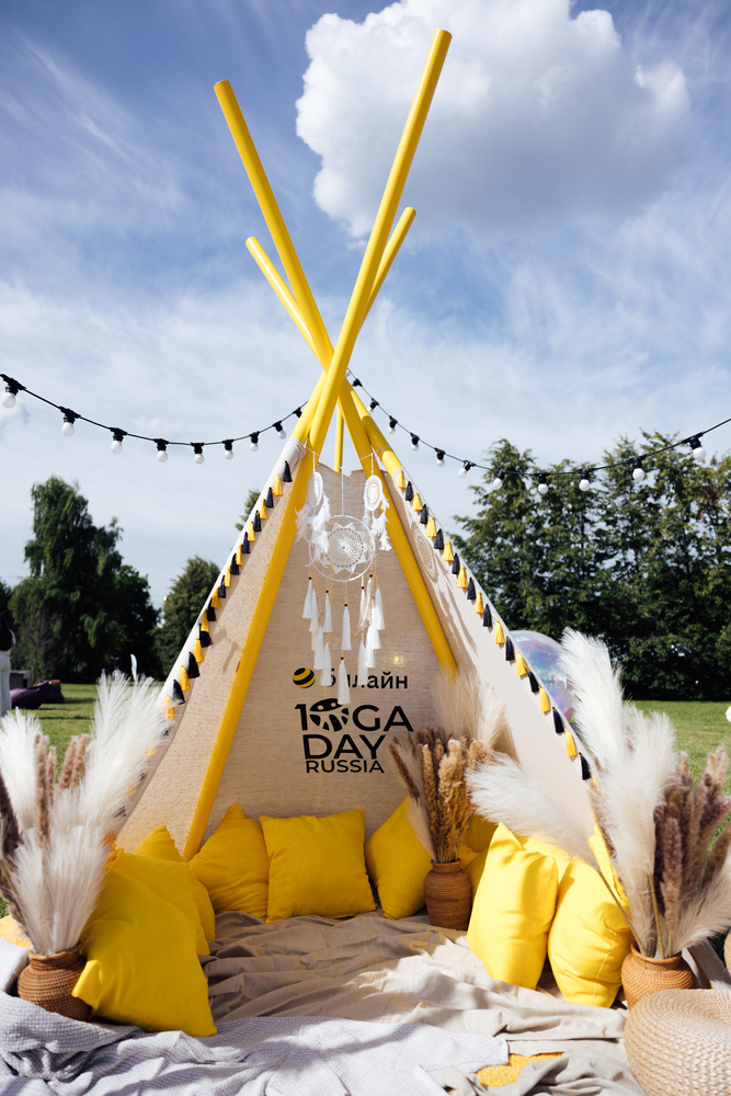 Мы буквально воссоздали тропу с йога-заданиями, где все желающие вдохновлялись небом на огромных мягких пуфах, кидали кубики с асанами из йоги и старались их повторить, рисовали апперов билайна на художественном мастер-классе, фотографировались в вигваме и получали напутствие на будущее с помощью метафорических карт.