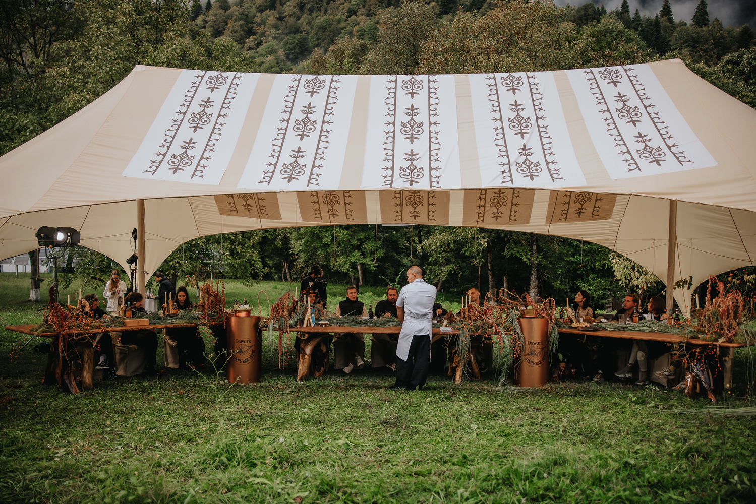 Вместе мы отправились в культурно-гастрономическую экспедицию по России. В июне были в Михайловском, где встретились с мифом о «нашем всём», Пушкине. В сентябре исследовали традиции коренного народа Причерноморья в горах Красной Поляны. В качестве центрального символа проекта мы определили большой общий стол. На нём появлялись и складывались в гастрономические истории блюда, придуманные Владимиром Мухиным. За ним собирались герои нашего времени, движимые любопытством и любовью к жизни.