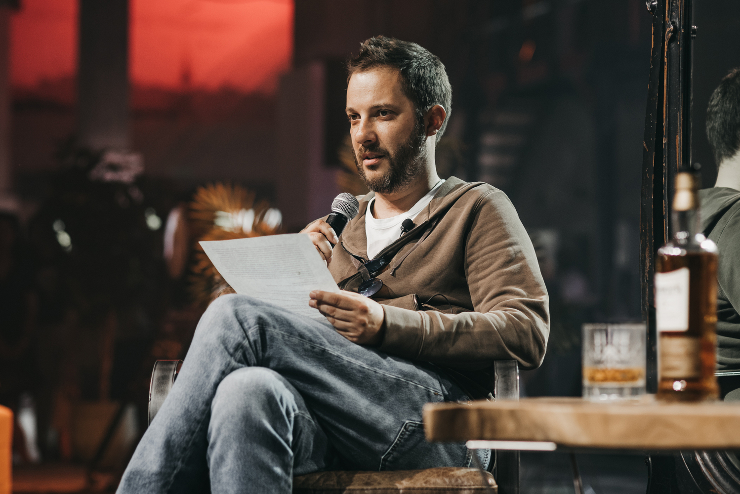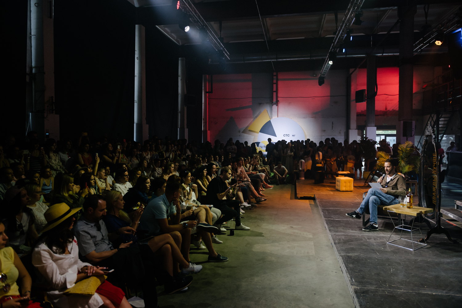 Третья зона была вообще не в этом мире. Мы сделали digital-площадку, где на экране можно было понаблюдать за известным писателем Александром Цыпкиным, который на сцене у большого зеркала спорил сам с собой, подвергая критике выжимки из собственных произведений.