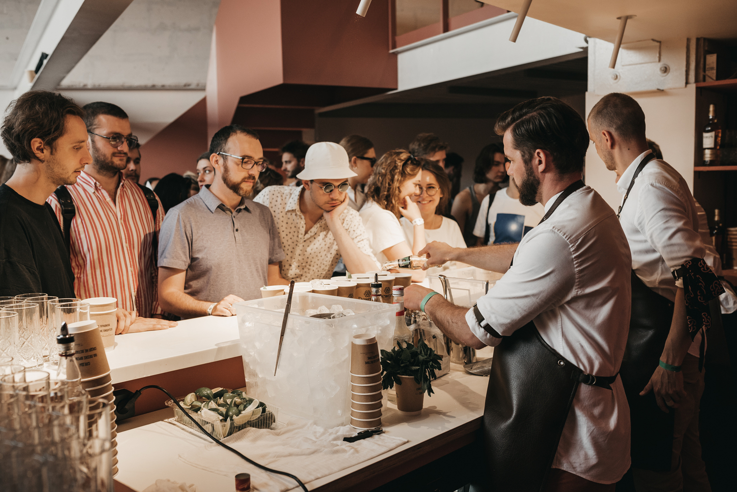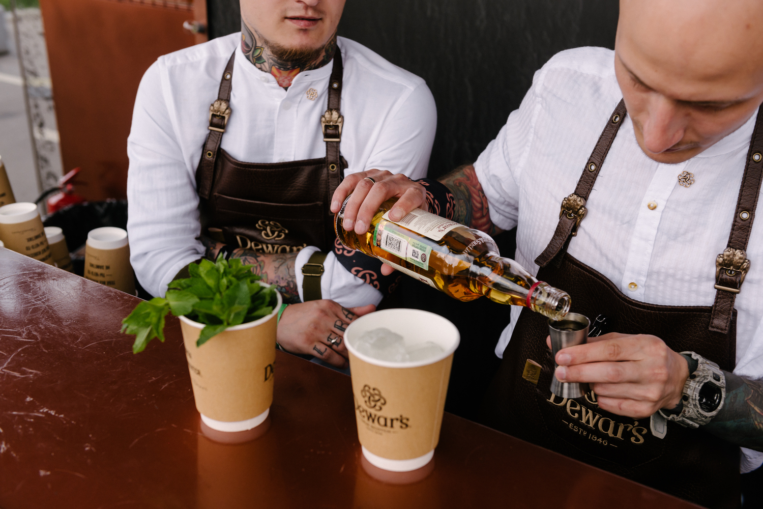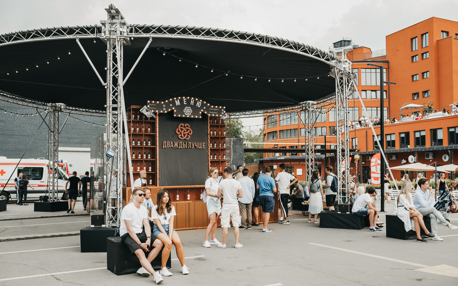 Основной акцент был сделан на центральный бар, где можно было эксклюзивно получить алкоголь на фестивале. Под большим купольным шатром мы разместили два бара-близнеца, зеркально отражавших друг друга. Кроме баров, близнецами были и бармены. Дело в том, что основная идея бренда звучит как “дважды лучше”. Тему дуальности мы протянули через всю коммуникацию, как и культ личности Томаса Дюэра, одного из сыновей основателя бренда. Его остроумные цитаты украсили бумажные стаканчики, а импровизированная гостиная стала зоной отдыха, с портретом хозяина на большом зеркале. Получилось атмосферно, гости беседовали и потягивали коктейли на удобных диванах.