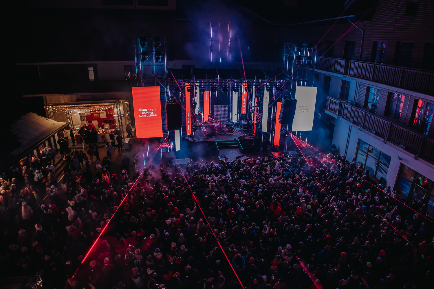 На Аллее флагов расположили три бара и фотозону, на которой запечатлели ценные моменты общения с друзьями. На MAIN MUSIC EVEN перед выступлением хедлайнера — L’ONE окрасили аллею в красно-белые цвета и на экранах сцены транслировали манифесты бренда. Так мы напомнили зрителям о важности близкого общения, ведь «голоса — громче голосовых».