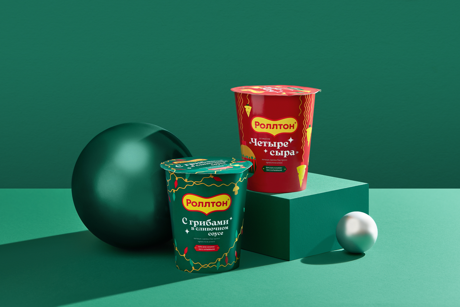 Использовали элементы праздника и узнаваемые цвета Нового года — красный и зеленый. Объединили всё это со вкусами нового набора лапши «Роллтон». Получилась стильная упаковка с «лапшичной» гирляндой, грибочками, елочными игрушками в виде сыра и позитивными предсказаниями, спрятанными под крышками любимых вкусов. Новогоднее настроение было обеспечено!