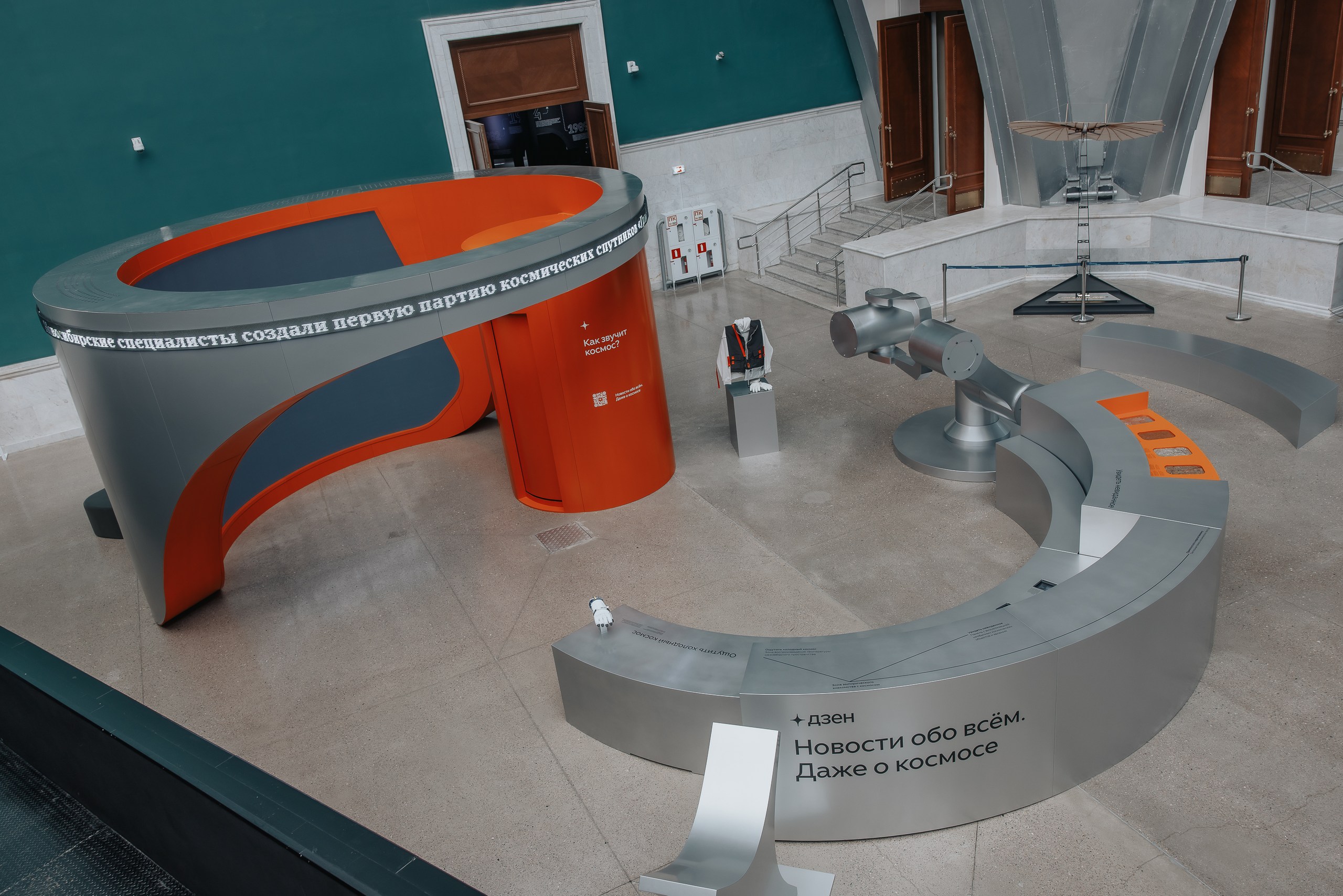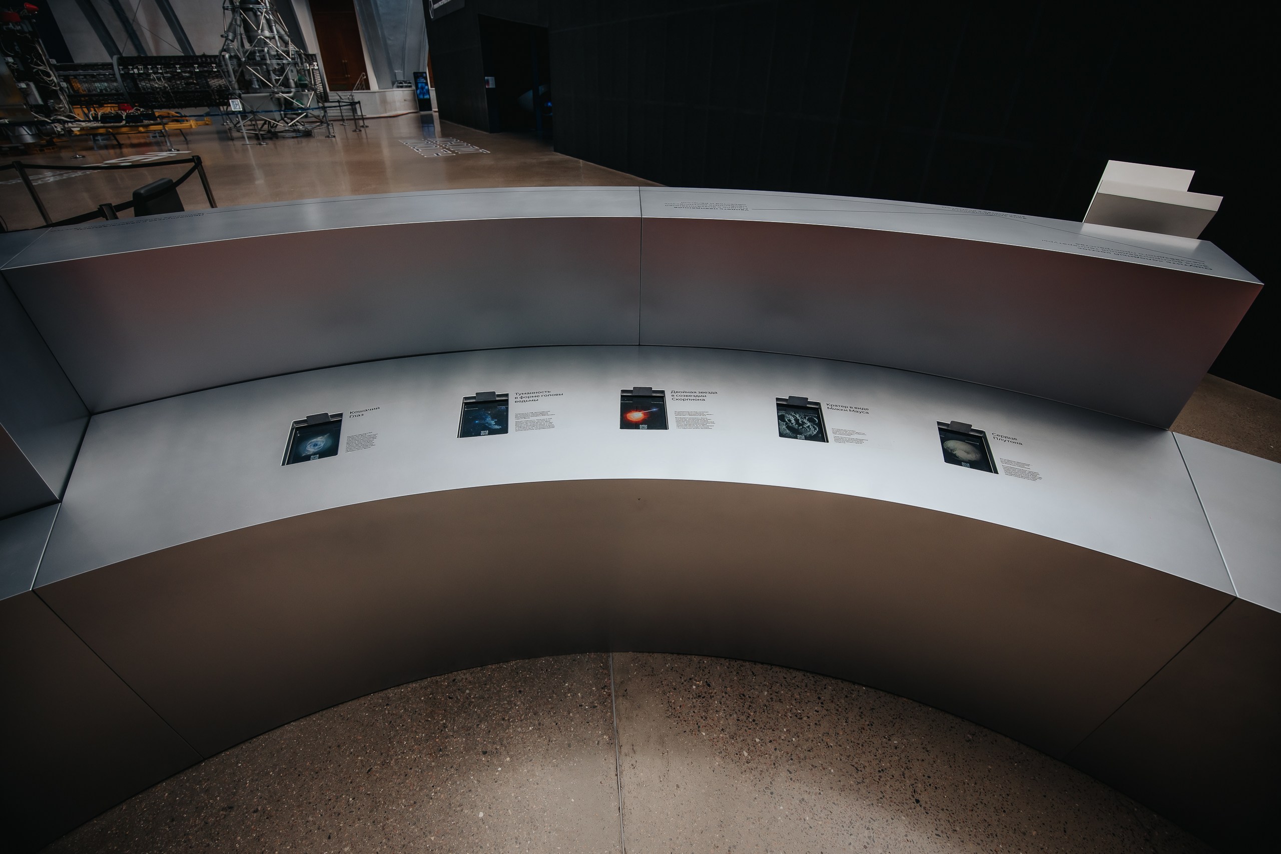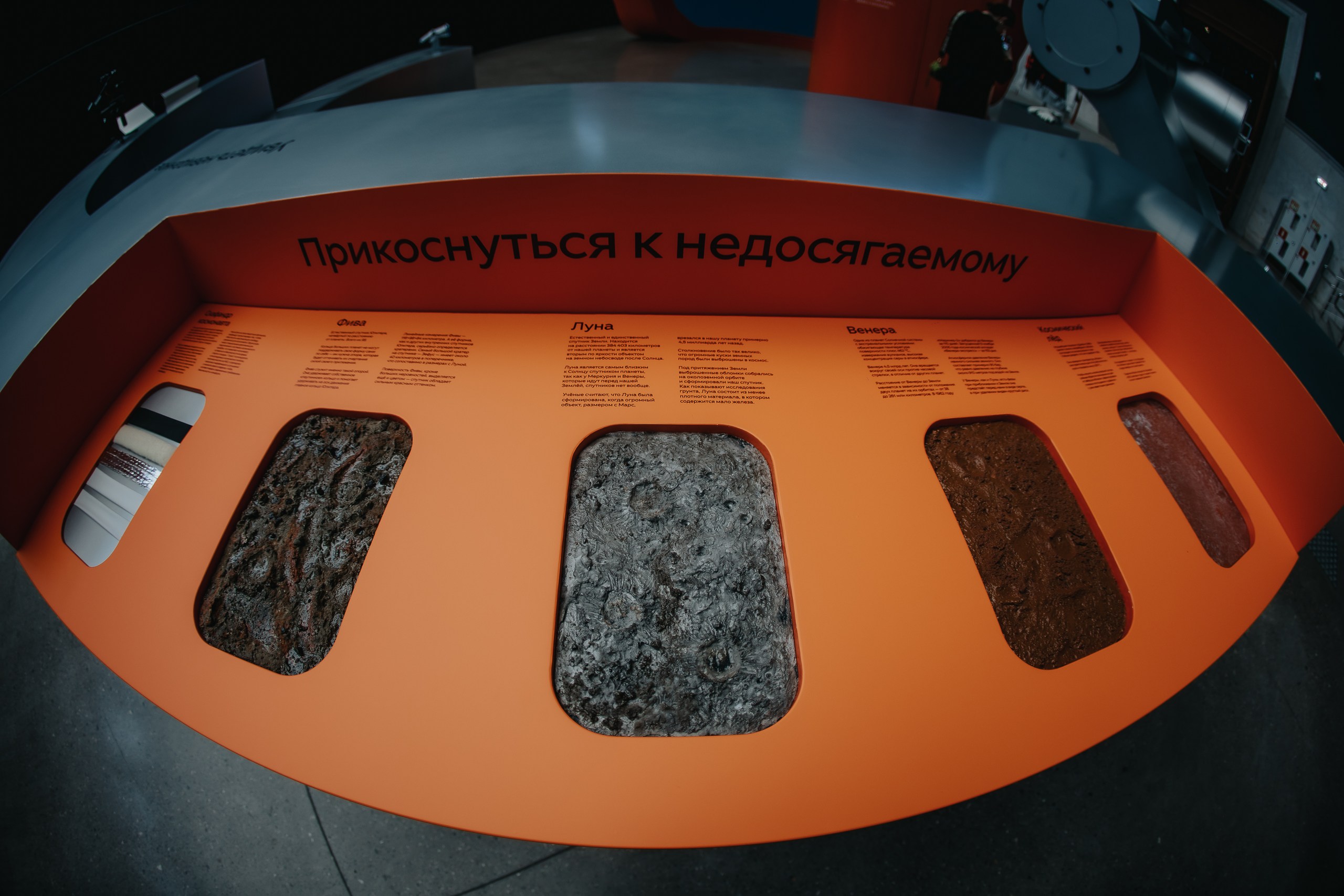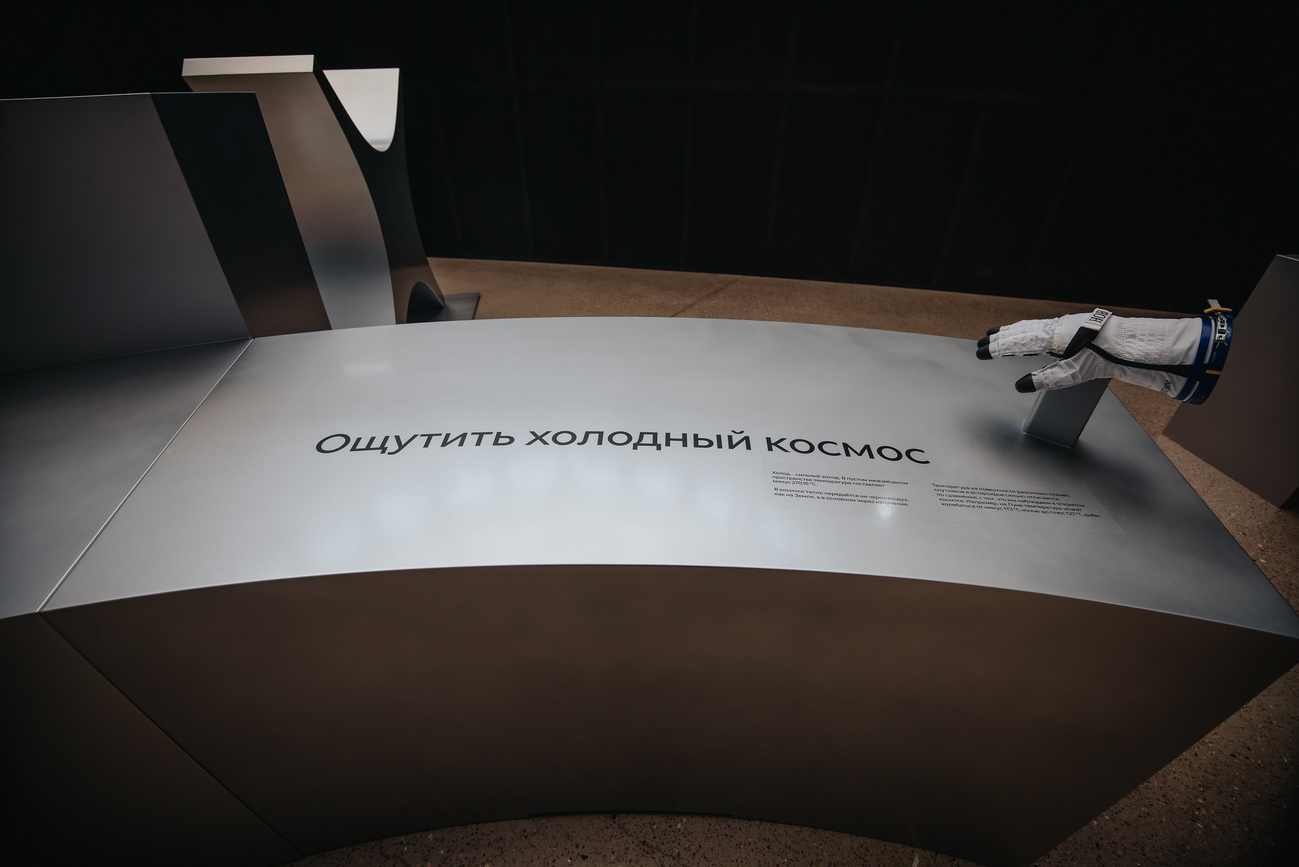 Бренд-зона — функциональный арт-объект с точками интерактивного контакта и приближения гостей к космосу на расстояние вытянутой руки: космические текстуры на панели «Прикоснуться к недосягаемому», визуализация необычных космических явлений, перчатка скафандра, интерактивный телескоп c информацией про МКС. Кульминация погружения в космические ощущения — пространство с воспроизведением сигналов и колебаний, которые можно было бы услышать за пределами планеты Земля.