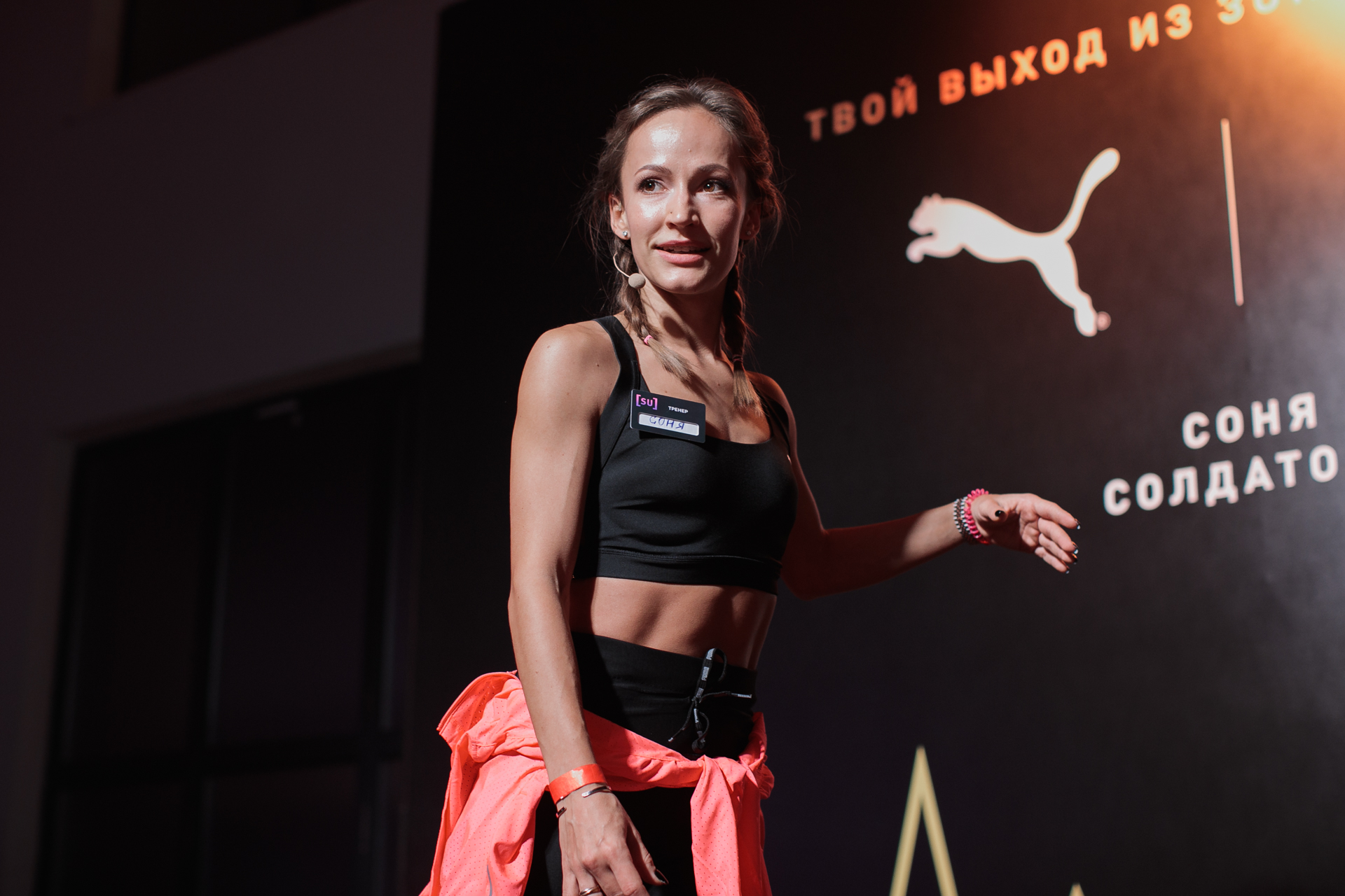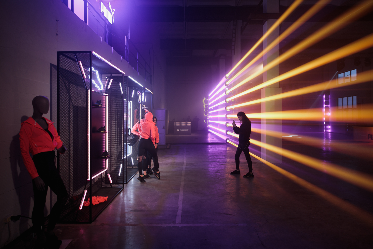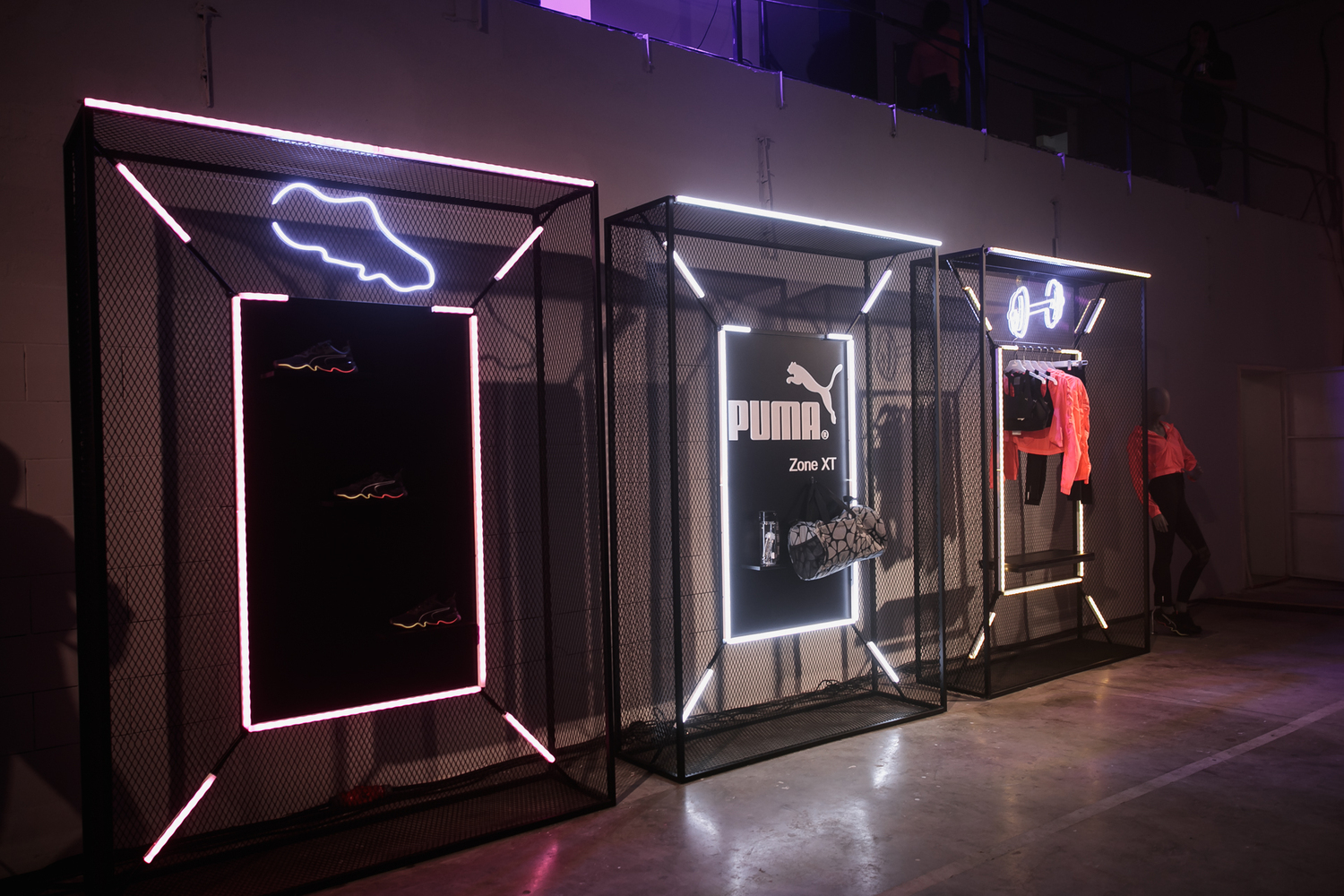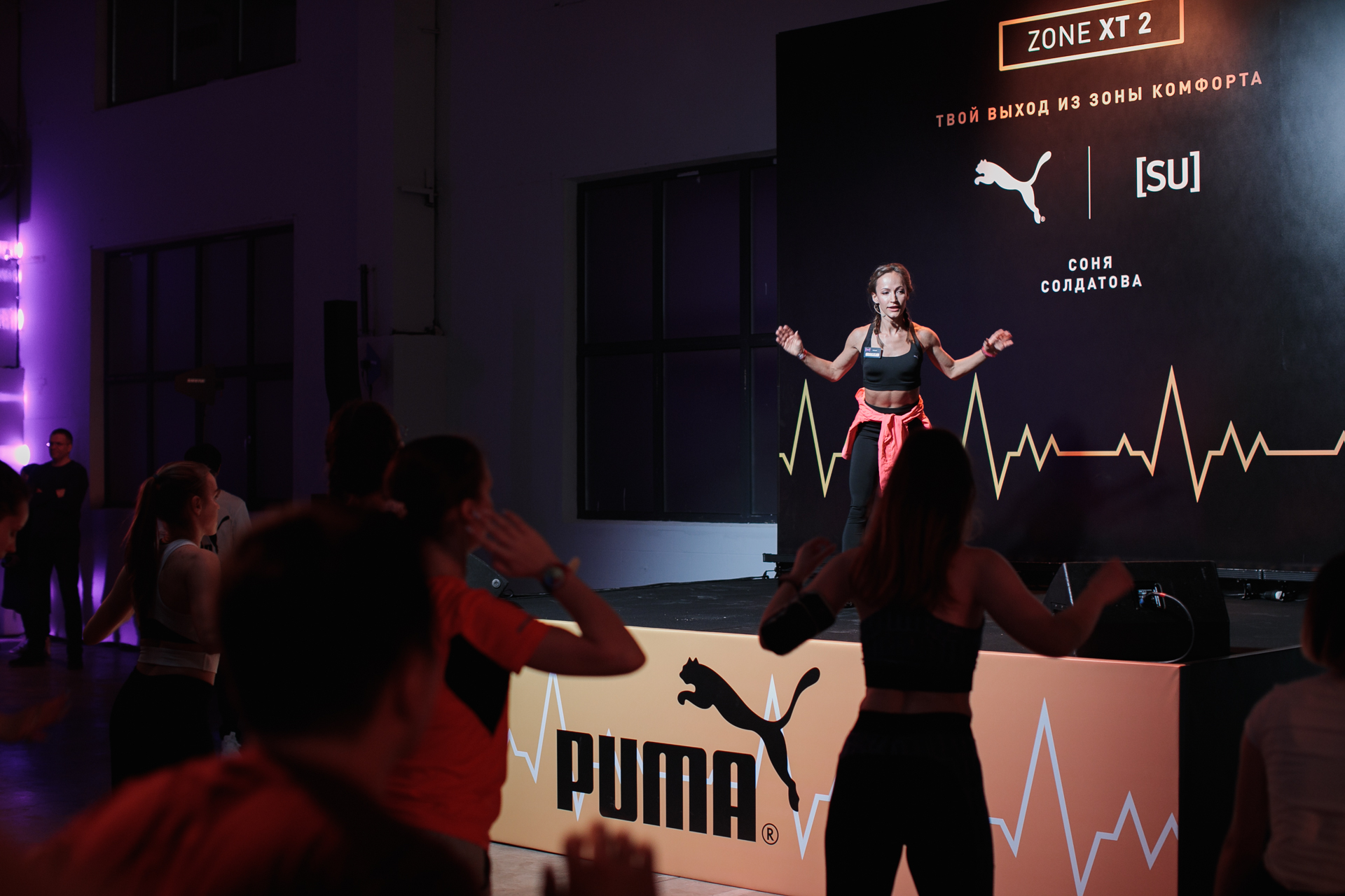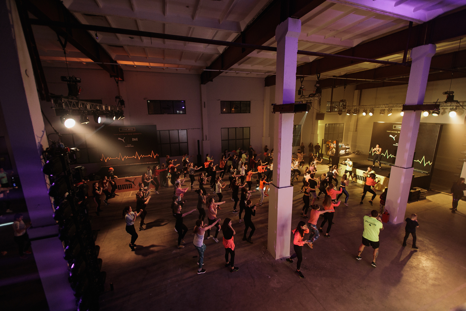За основу мы взяли идею о том, что любая высокоинтенсивная тренировка – это проверка на прочность не только физических возможностей, но и спортивной экипировки. Объединив это с красивой цветовой палитрой PUMA ZXT и трендом на индастриал-стиль, мы построили настоящий андеграундный Boot Camp, состоящий из трех зон для разных уровней физических нагрузок. Каждая зона была отделена от других яркими лазерными лучами и создавала впечатление отдельной спорт-площадки. Под каждый уровень нагрузок была разработана отдельная программа амбассадорами бренда: разминка от Сони Солдатовой, повышение накала во второй зоне от Марии Николаенко и самая интенсивная, завершающая часть XT от Алины Загитовой.