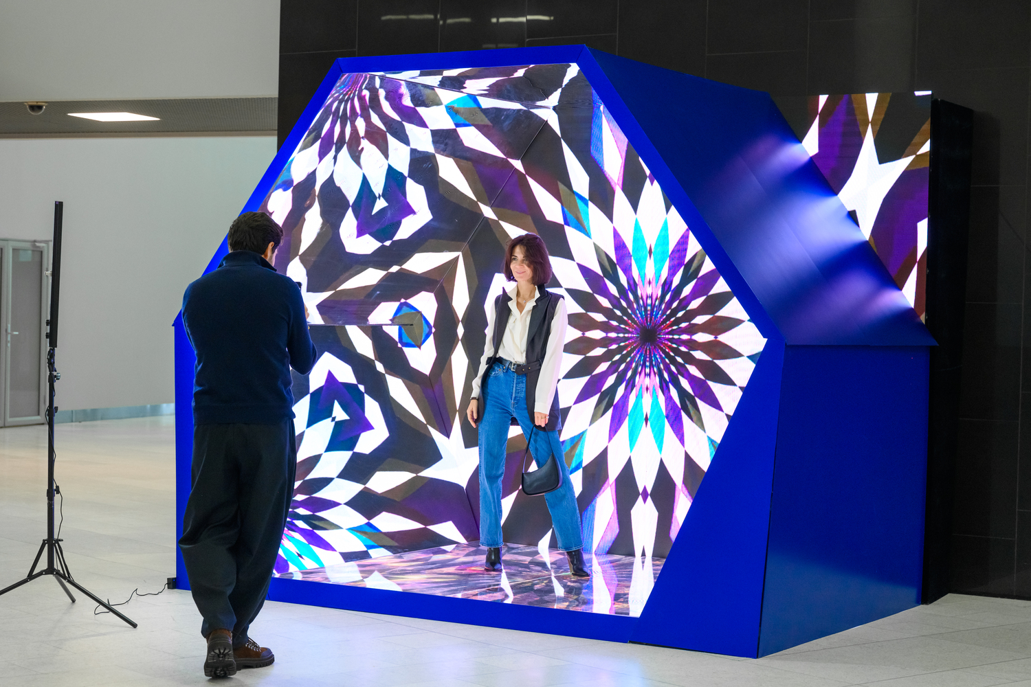 Площадку мы украсили световой арт-инсталляцией и арт-объектом в виде зеркального шестиугольника. В общем пространстве соорудили 50-метровый стол для обеда и красиво сервировали его белой скатертью, ветками зелени и свечами. Зоны, где можно отдохнуть и пообщаться, мы оформили в домашнем стиле со светодиодными лампами в цветах бренда.