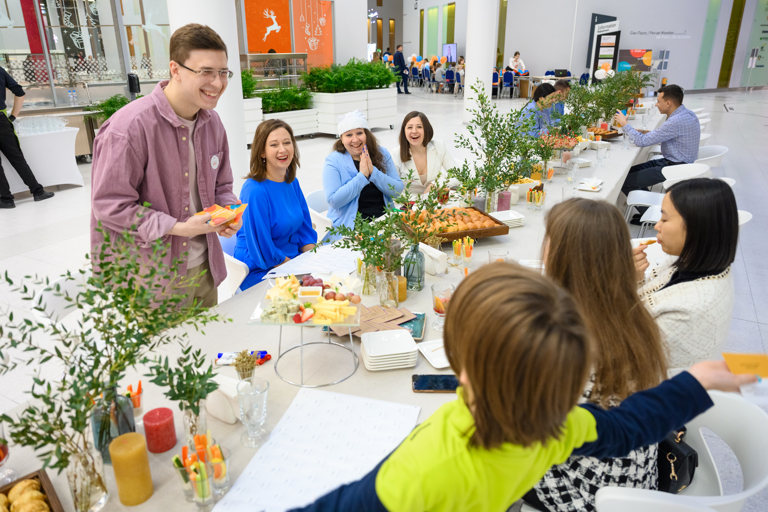 Гостей мы вовлекли в общение при помощи игры, где они отвечали на вопросы из карточек и обсуждали ответы друг друга. Это помогло всем расслабиться и познакомиться поближе. А еще перед гостями выступили: скрипач, балерины, фристайлер с мастер-классом по битам и артисты из театра теней.
